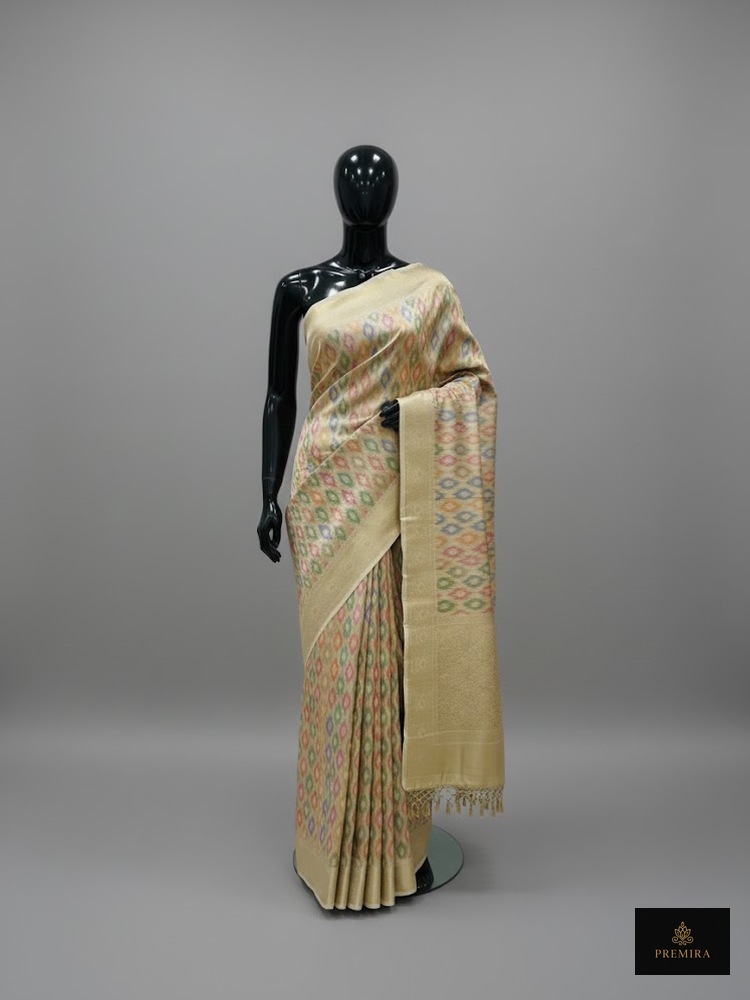 This elegant Patola Saree is a masterful blend of traditional craftsmanship and contemporary luxury, featuring rich geometric patterns and a sophisticated color palette.