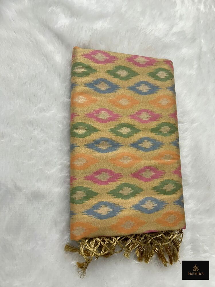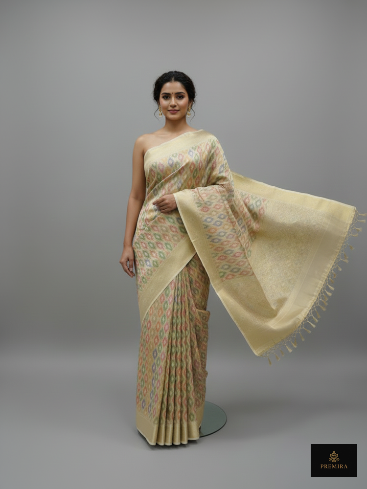 Border: Sleek, broad Golden Zari border for a clean, designer look