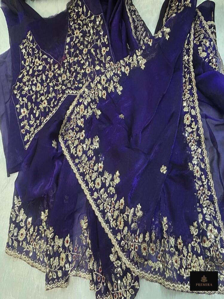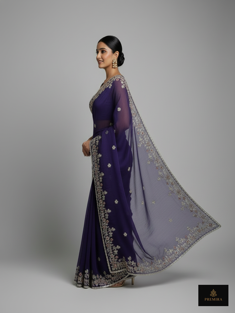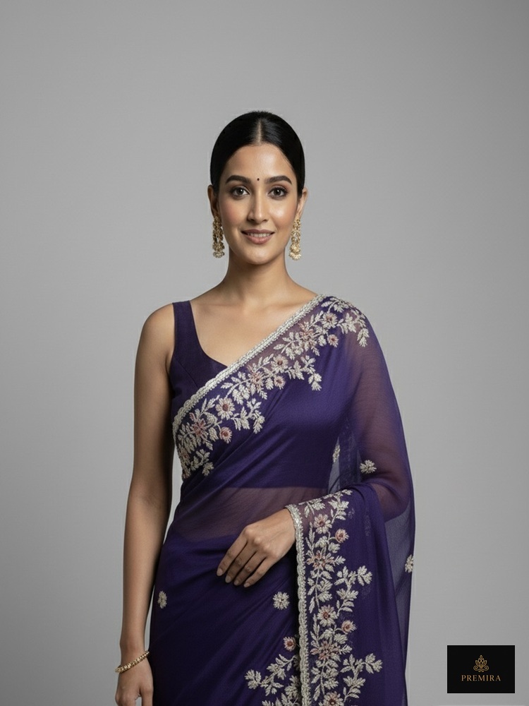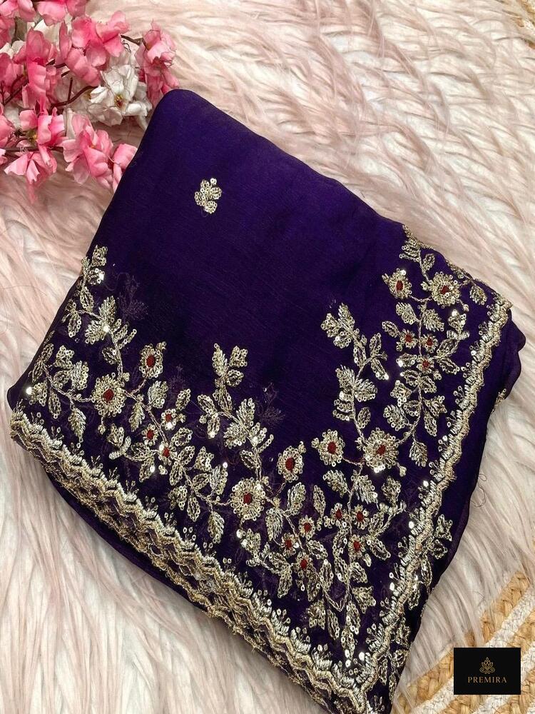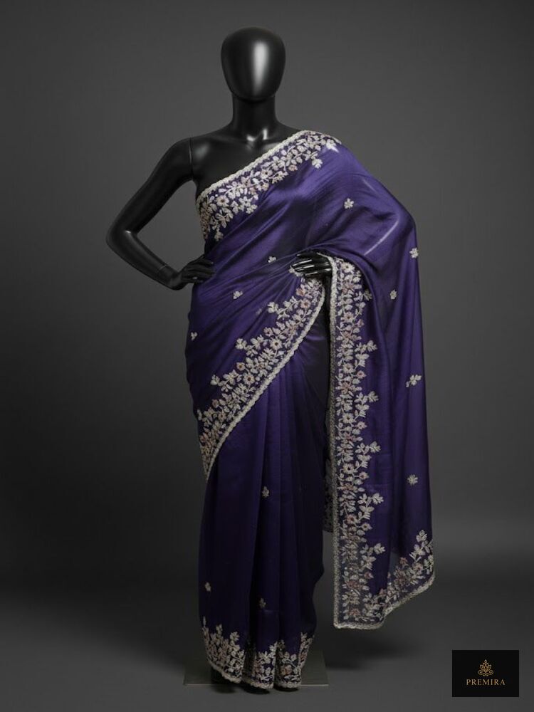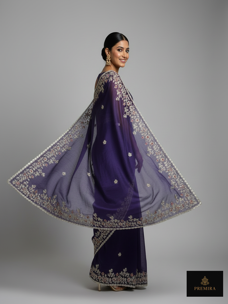 The royal purple saree features elegant floral embroidery and a clean silhouette, perfect for evening wear and formal celebrations. Unlike heavily embellished sarees, this piece focuses on a clean body with a decorative border, offering a sophisticated look. The minimalist body with a detailed pallu makes it suitable for both modern and traditional styling.