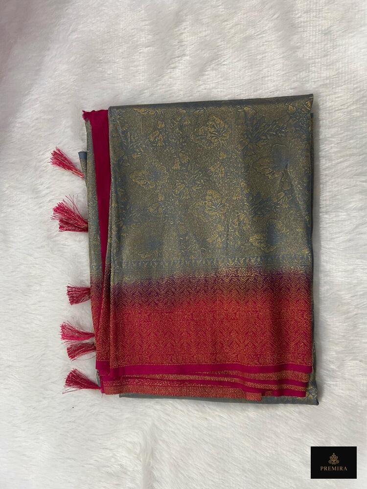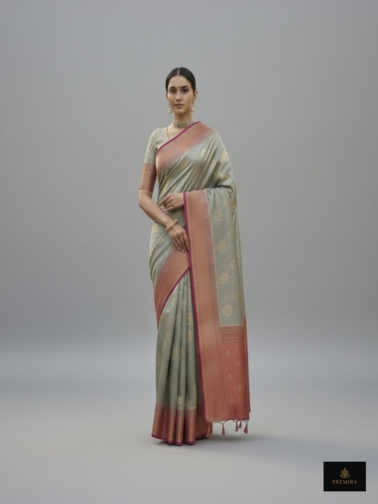 Step into a world of timeless royalty with the Premira Heritage Silk Saree. This exquisite piece features a shimmering sage-silver body adorned with traditional motifs, creating a look of understated luxury. The striking crimson border and heavy zari pallu offer a bold, festive contrast, making it an ideal choice for grand weddings and religious ceremonies. Finished with elegant hand-knotted tassels, this saree is designed for the woman who carries tradition with effortless grace.
