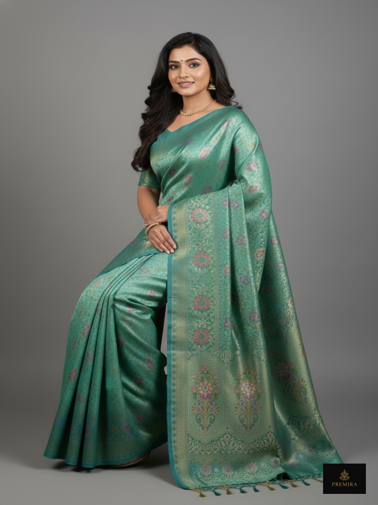 The exquisite Seafoam Teal Banarasi Silk Saree is a masterpiece of traditional weaving. The saree is adorned with an intricate floral jaal pattern in shimmering gold and subtle pink hues. The heavy Zari border and ornate pallu, finished with delicate hand-knotted tassels, make it an ideal choice for grand celebrations. This saree is designed for the woman who values heritage craftsmanship and a high-sheen, sophisticated finish.